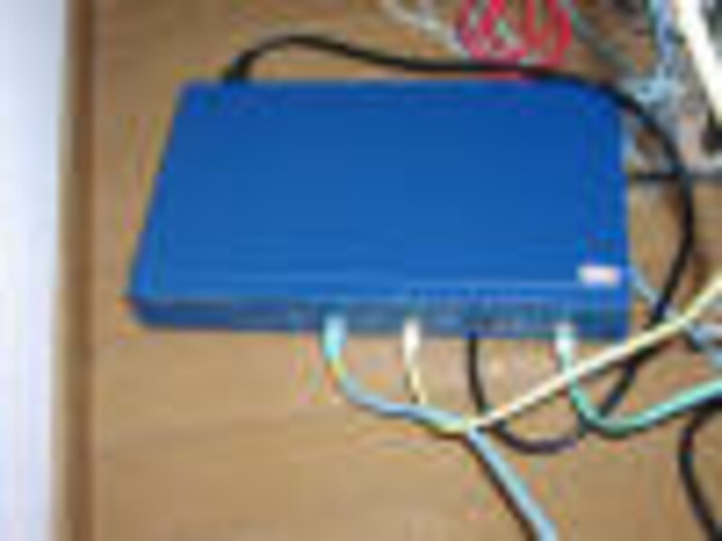 このケーブルをハブに接続します。一番左のケーブルは、CATVモデムからのケーブルです。今回のIPアドレスは、CATVのセンターにあるルータのDHCP機能で割り振っています。左から2つ目と4つ目のポートに接続したケーブルが、1000BASE-TのNICからのケーブルです。共に1000BASEでLINKしていることがLEDの表示で分かります。