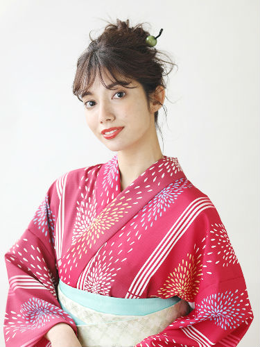 華やかな花火柄の浴衣に、まるで花火が開いているようなバックスタイルのヘアアレンジを合わせてテンションアップ! お団子を作ったあとに、毛先をしっかりとコテで巻くのが華やかに見せるコツです。前髪は32ミリのコテでふんわりと巻いてシースルーバングに。