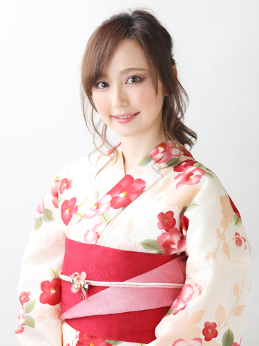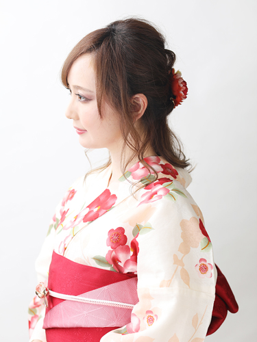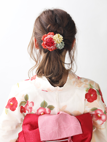 浴衣の柄に合わせ、赤色が主役のコサージュをセレクト。大人っぽいヘアアレンジなので、ヘア小物使いでハツラツとした印象に仕上げています。年齢を問わず似合うデザインなので、大人の女性にもおすすめです。