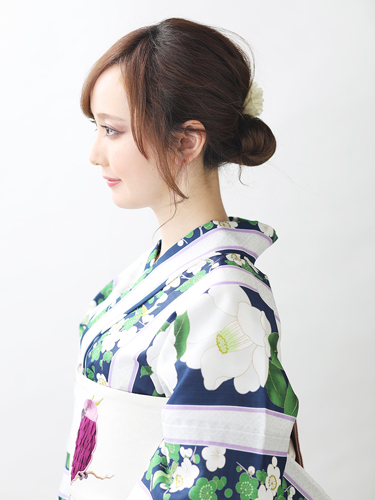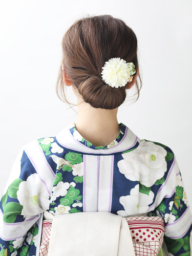 浴衣の柄と色をリンクさせた、白い花のかんざしです。ボリュームのある白い花のコサージュの脇には、黄緑とクリーム色のつまみ細工。コンパクトなヘアアレンジには大ぶりのヘア小物が映えます。