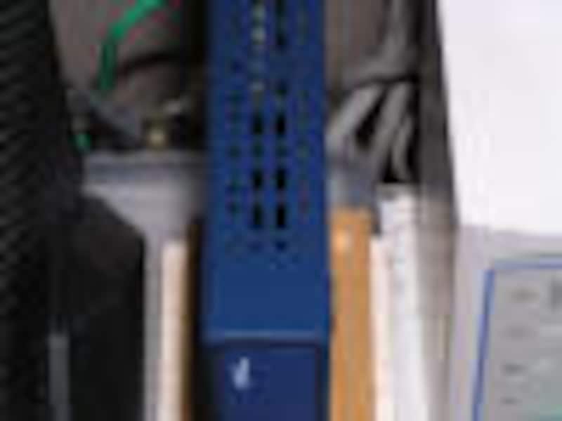 この状態でしばらく使ってみましたが、確実に放熱効率が高まり、ルータを触っても熱くなくなりました。FANなどを付けると、結構な騒音がでますので、自然対流が一番です。また、ほかのメリットとして縦置きにするとほかの機器の間に具合良く納まるということもあります。下の写真をご覧下さい。