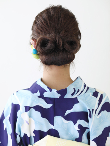 幼い頃に駄菓子屋で見た大きな飴玉を想わせる、トンボ玉のかんざし。トンボ玉を使ったヘアアクセは、涼やかで夏のシーンにぴったりです。寒色の花コサージュを加えれば、甘すぎない女子っぽさを出せますよ。