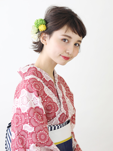 トレンドの外ハネを取り入れて、浴衣スタイルをカジュアルに。耳の下で“くびれ”ラインを作ることで、かわいさもプラスできます。正面から見たとき両左右から毛先が見えるよう、しっかりコテで巻いておきます。