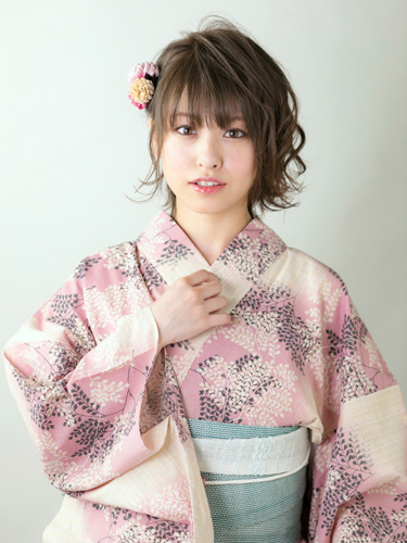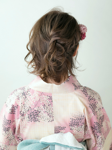浴衣をカジュアルに着こなしたいなら、こんなアシンメトリーなダウンスタイルにトライしてみて。正面から見て華やかなだけでなく、左右で印象がガラッと変わるのも、このアレンジの魅力です。かわいらしい浴衣はもちろん、キリッとした浴衣&ヘアアクセサリーで粋に仕上げても◎。