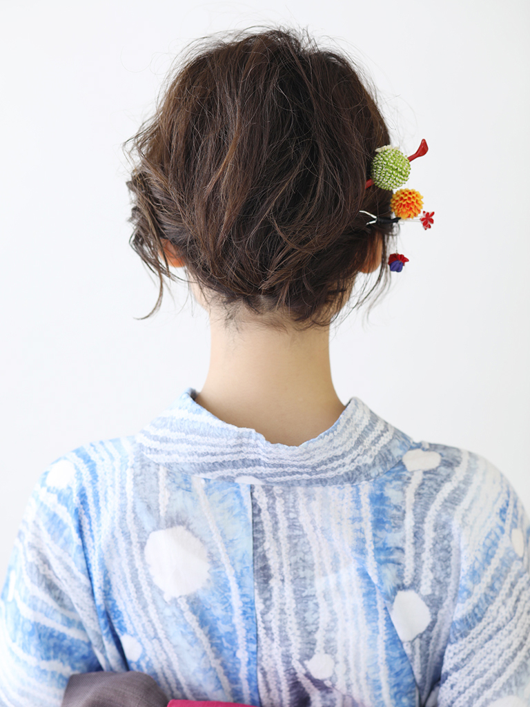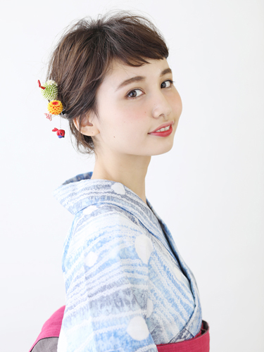 ショートレングスでも、夜会巻きのニュアンスが楽しめる浴衣ヘアアレンジ。えり足の髪をスッキリさせることでかわいらしさがアップします。オン眉の前髪をさらにコテで巻き、斜めに流して個性的な印象にするのが大人流。頭を小さく見せる効果も抜群のアレンジです。