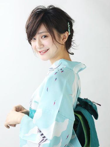 正面から見るとしっとりとしてきれいめ、後ろから見るとふわふわとした毛流れが印象的な、前後のギャップを楽しめる浴衣ヘアアレンジ。襟足の髪をくるりんぱでまとめることで、ショートでありながらフルアップにしたように見える髪型です。髪がパサついていると季節感が出ないので、ヘアオイルでツヤと濡れ感をプラスします。