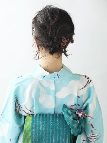 アンティークゴールドのワイヤーで大小のクリスタルを編んだヘアクリップは、帯のドット柄とのリンクを楽しんで。ターコイズ風のストーンが並ぶヘアクリップは、浴衣と色味を合わせて、全身をトータルにコーディネート。