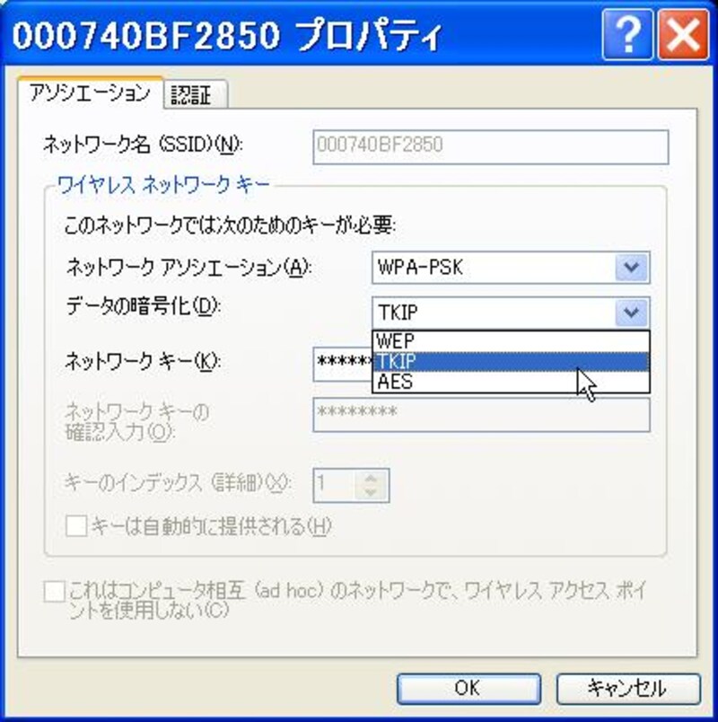 ・「ネットワークアソシエーション」で「WPA-PSK」を選択し「ネットワークキー」で「TKIP」または「AES」を選択する。