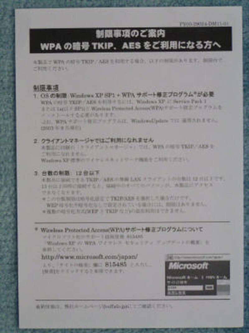 上の写真でWPAに関するリーフレットを見て下さい。以前の製品では、サポートセンターに問い合わせないとWPAを使う方法が分かりませんでしたが、今回の製品からは、このリーフレットを読めば分かるようになりました。要するに、WindowsXPをWindows UpdateでSP1にし、そのほかの対応パッチをあててから、Windowsの「ワイヤレスネットワーク接続」を使え、ということです。