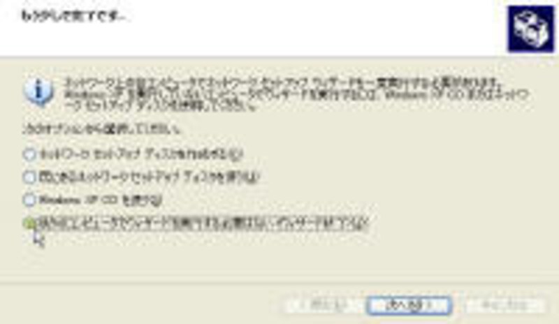 Windows98/Me/2000などのコンピュータもLANの設定をしたい場合はここで一番上のオプションを選択し「ネットワークセットアップディスク」を作成してください。フロッピーディスクに設定のためのプログラムが記録されます。WindowsXPの設定を終了したあと、該当のコンピュータでそのフロッピーディスクを開き実行ファイルを起動してください。