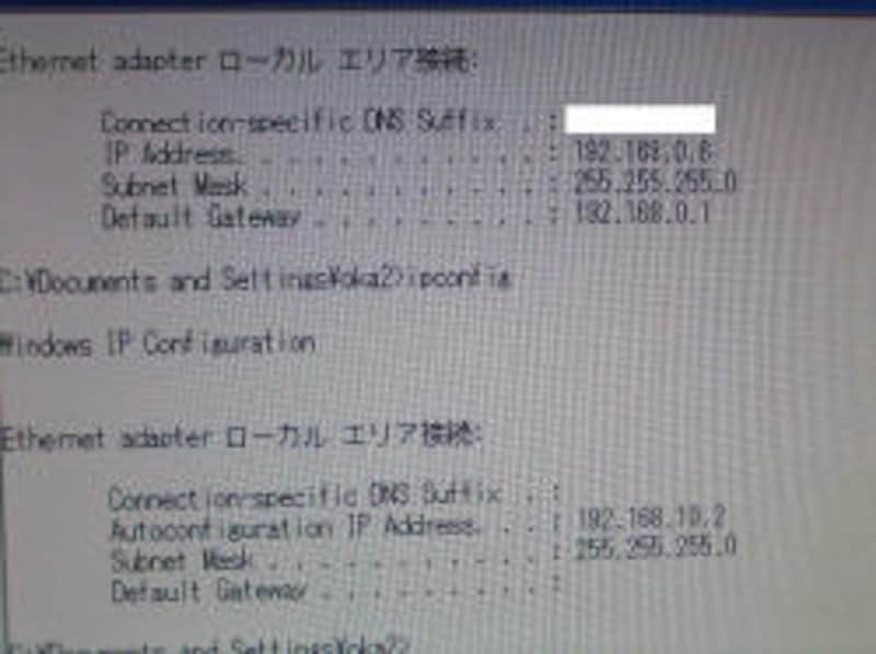 下の写真は、自動で取得したIPアドレスから、手動で指定したIPアドレスに切り替わる瞬間の写真です。IPアドレスは、IPCONFIGコマンドを連続実行して表示し、ちょうどIPアドレスが変わったところを撮影しています。時間にして数10秒といったところでしょう。