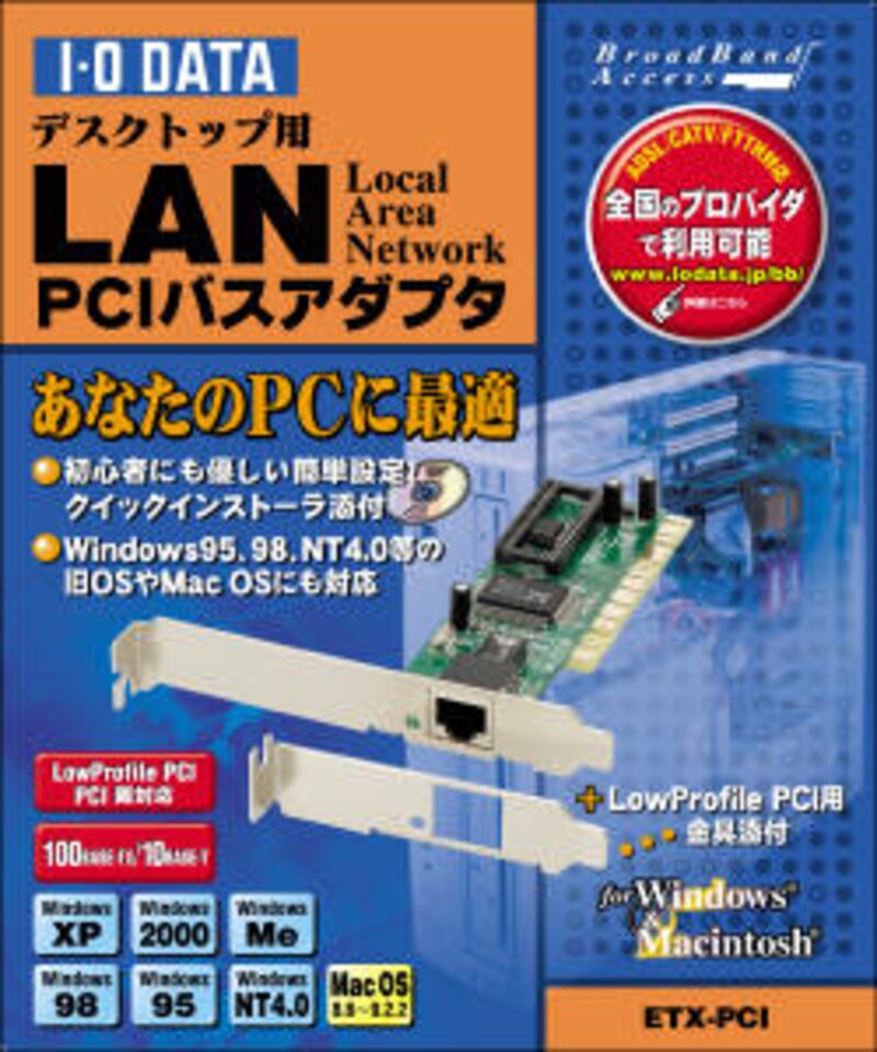 100BASE-TXのLANボードには、以下のように細身のボードと若干幅の広いボードがあります 。設置する場所が狭い場合は、細身の製品をお勧めしますが、一般的な自作デスクトップのケースであれば、特に差異はありません。設置するスロットは、もちろんPCIスロットです。対応するWindowsのオペレーティングシステムは箱に明記してありますので、確認してから購入するようにしてください。