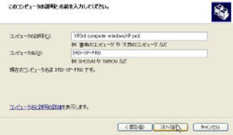 ↑「コンピュータ名」は、ほかのコンピュータと異なる名称を必ず英文字(15文字以内)で設定します。「コンピュータの説明」は本来漢字も利用できるのですが、トラブルの元になりますので、すべて英文字で設定した方が無難です。