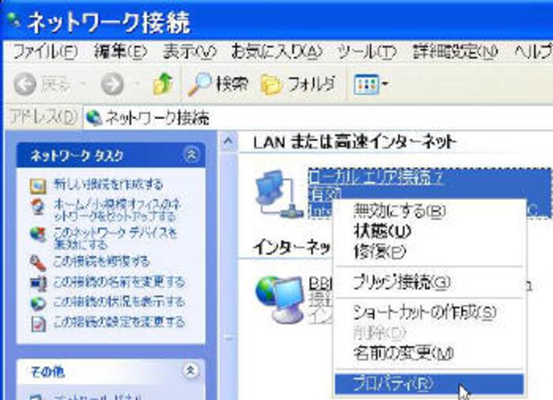 (2)ローカルエリア接続を右クリックし「プロパティ」を選択する。