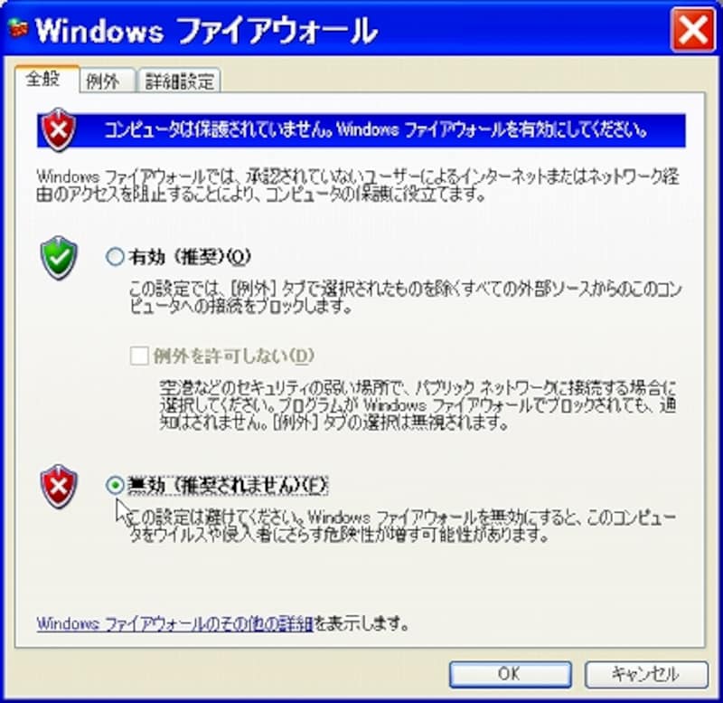 ファイヤーウォールを解除すると、外部からの不正アクセスが心配になります。しかし、ルータを通してインターネットに接続しているのであれば、それほど心配することは ないでしょう。初心者の方がWWWサーバを立てていてているとか、何かの都合で常時インターネットに接続したままにしてあると言った場合は別ですが、仕事が終わったあと趣味でインターネットを利用するといった程度であれば、あまり神経質にならなくてもよいでしょう。