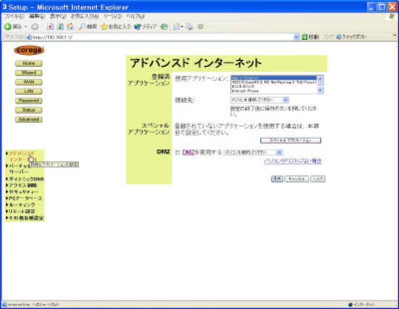 ▽以下は、ルータを通すと支障の出るアプリケーションのための設定です。DMZの設定も見られてます。DMZとは、直訳すると「非武装地帯」となり、直接接続を可能にすることです。ただ、ルータによる支障はなくなりますが、セキュリティは0となります。