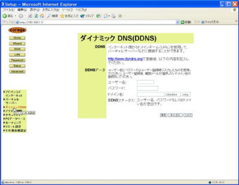 ▽WAN側のIPアドレスが変動しても、固定のドメイン名でアクセスできるようにする設定です。ダイナミックDNSのサービスを提供しているサイトと連携を取って設定を行います。