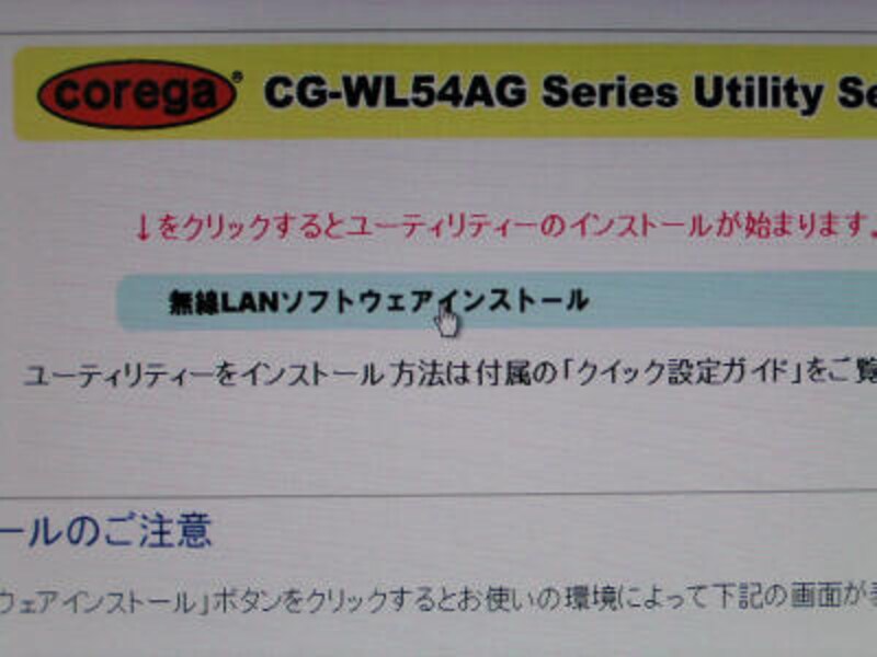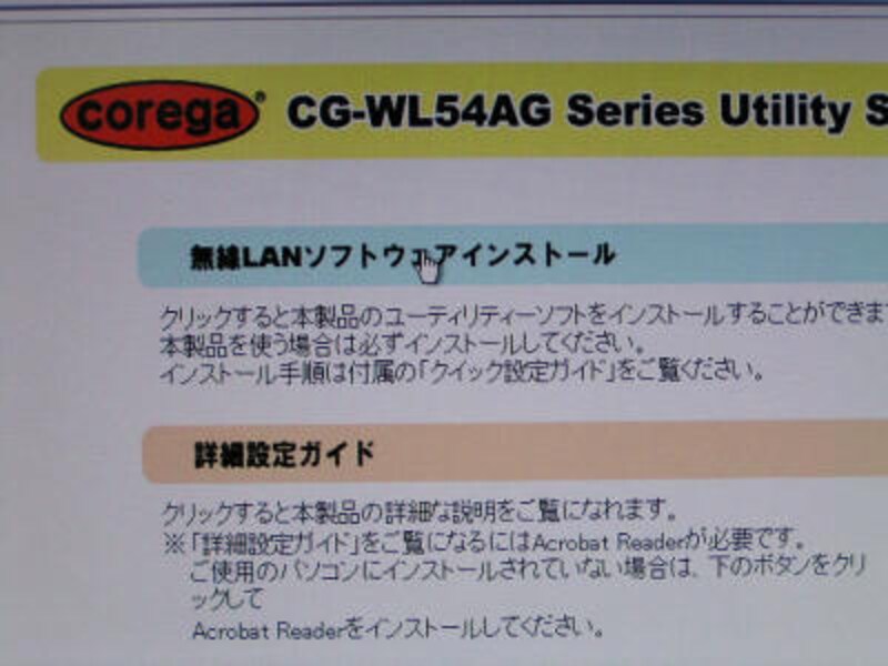 それでは、インストールは簡単かをチェックしてみましょう。本製品には、ルータ設定用のCD-ROMと無線子機側のCD-ROMが付属しています。後者には、無線LANカードのドライバとユーティリティが入っています。Windowsにも、子機側を独自に制御する機構がありますが、今回はメーカからのユーティリティを利用してみます。