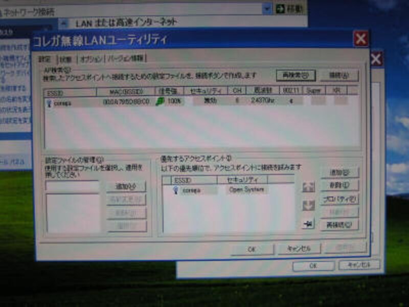 ↓接続用ユーティリティを開いてみた。こちらでも無事接続してるようだ。暗号は、「無効」になっているので、実際の利用ではぜひ有効にして欲しい。ここでは、実効値の計測のため「無効」のままにしておく。無線モードは、11gになっていることにも注意したい。