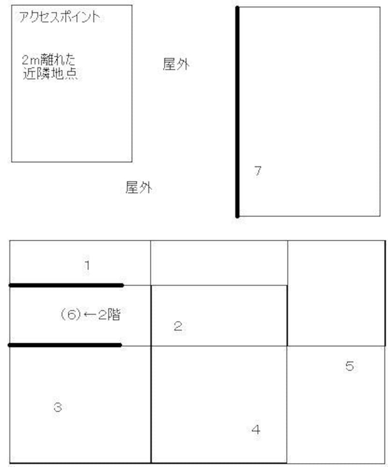 調査地点は、2m離れた近隣地点と屋外を挟んで1~7までのポイントです。ポイント7は、外壁がモルタルなので電波が届きにくくなっています。左下にある太線は、コンクリートブロックの壁を表しています。6は、表示した位置の2階で測定しました。ほかはすべて1階部分での測定です。