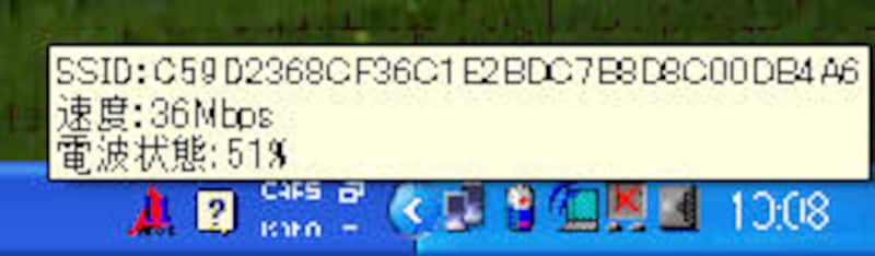 壁2つ隔てたところで測定したので、下の図のように電波状態が57%、51%に落ち、接続速度もフル状態の54Mbpsから36Mbpsに落ちてしまいました。