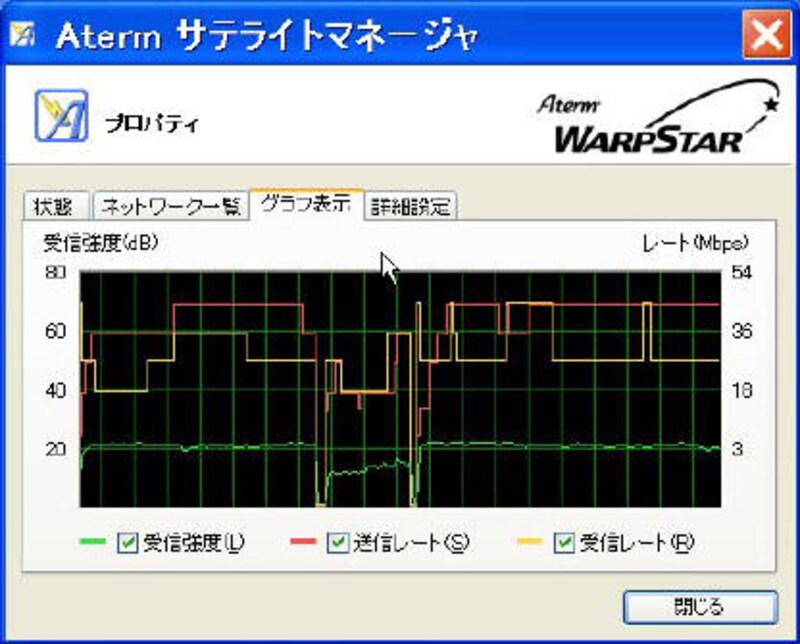 ここで、下のグラフを見てみましょう。下のグラフは、3つの部分に分かれています。左が11a、中央が11g、右が11aです。調査環境は、アクセスポイントとの間に金属製の障害物がある環境です。