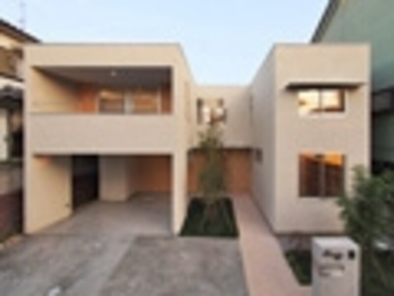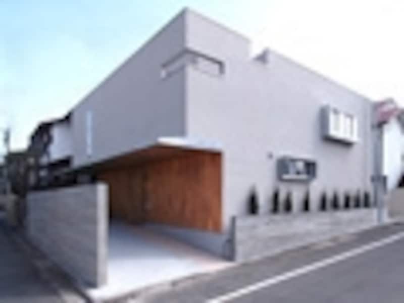 | 張り出したバルコニーとガラスブロックの窓が特徴的な東側の正面。1階のガレージには車が2台入る。家の手前にも1台分のスペースが確保されている。 |
