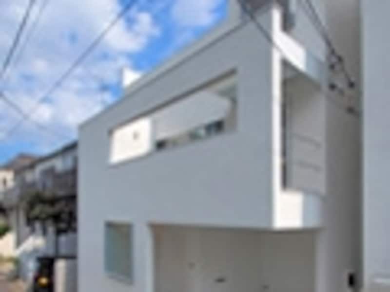最寄りの駅から歩くこと5分。幹線道路から路地を入ったマンションと小さな住宅が混在する一画に、3階建ての白い家が建っています。ここは典型的な住宅密集地で、東側が前面道路に接し、西側が狭い路地の突き当たりになっていて、南側と北側には隣家が迫っています。