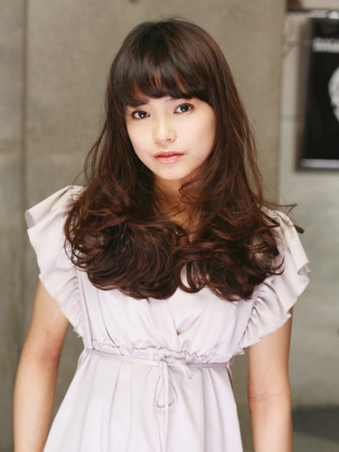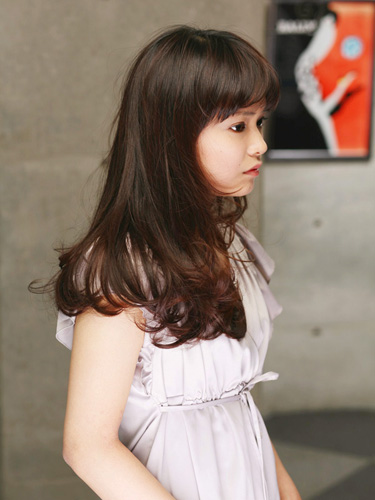 ボリュームのある前髪はイノセントな雰囲気。ただし、ロングヘアで前髪だけが重いと野暮ったくなるのでバランスが大切です。全体の重軽バランスを整えて、スタイル全体に甘い印象を残します。