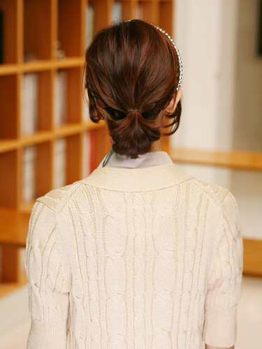 耳前の髪を残して、他の髪をすべて後ろでひとつにまとめます。結んだ後に、後頭部の髪を軽く引き出すと頭の形が丸くきれいな仕上がりに。結びきれない髪はピンで留めておきましょう。