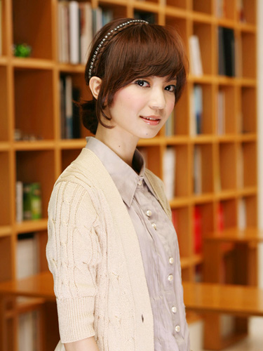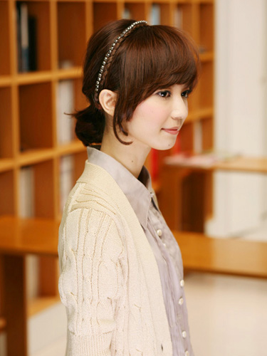 オフィスではすっきりと清潔感のあるアレンジが◎。前髪にボリュームがあるので顔まわりやトップのバランスがカギとなります。3Dフルバングを少し手櫛で流してオフィスに似合う軽やかさを出します。うしろの髪をすっきりとまとめることで、前髪のボリューム感が強調されて、品のいい雰囲気に。