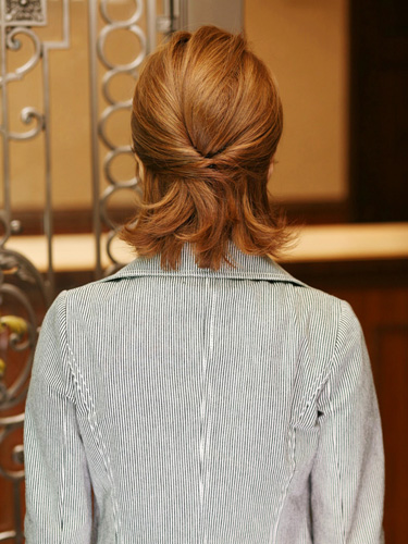 トップに高さを出したハーフアップはオフィスにぴったりの定番アレンジ。ただひとつに結んだだけのハーフアップではつまらないので、このスタイルでは両サイドからの髪の流れをいかすことでおしゃれ感をプラス。簡単なのに、アレンジ上手に見えるスタイルです。さらに、奥行きのある流し前髪とトップの高さとの相乗効果で、縦の長さが強調され凛とした雰囲気に。前髪はワックスでややタイトに流すとオフィシャル感が高まります。