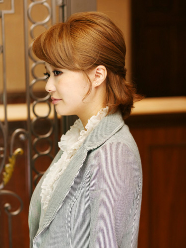 トップに逆毛を立て、両サイドの耳上の髪をねじりながら後頭部でピン留め。サイドの髪は、あまり多く取ると留まりにくくなるので注意しましょう。片側で留めたピンの位置を隠すように、もう片方の毛束をピンで固定すると仕上がりがきれいです。