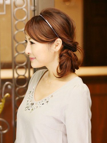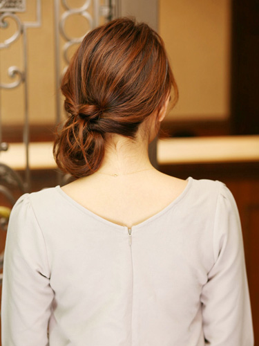 サイドで髪をひとまとめにしてゴムで結び、最後に毛束を輪っか状のおだんごにします。結び目の上に穴をあけ、おだんごを通してくるりんぱ。残った毛先部分は結び目に巻きつけ、仕上げにおだんごをほぐしてラフに整えたら完成です。