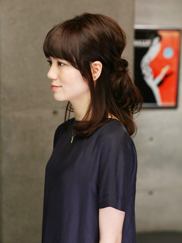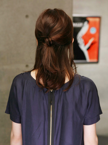 ハーフアップラインで結んだ髪の毛束を取って、結び目を隠すように巻きつけます。時計回りに巻きつけて結び目の右側にピンで固定。トップの髪を引き出して頭の丸みを強調するように形作ると、元々の頭の形までキレイに見せることができて◎。