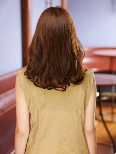 前髪からサイドにかけて軽くリバースの動きをつけ、その毛流れでサイドにボリュームをプラス。そうすると大人っぽく見せる効果が期待できます。前髪にもふんわりとしたカールのボリューム感を出すのが◎。