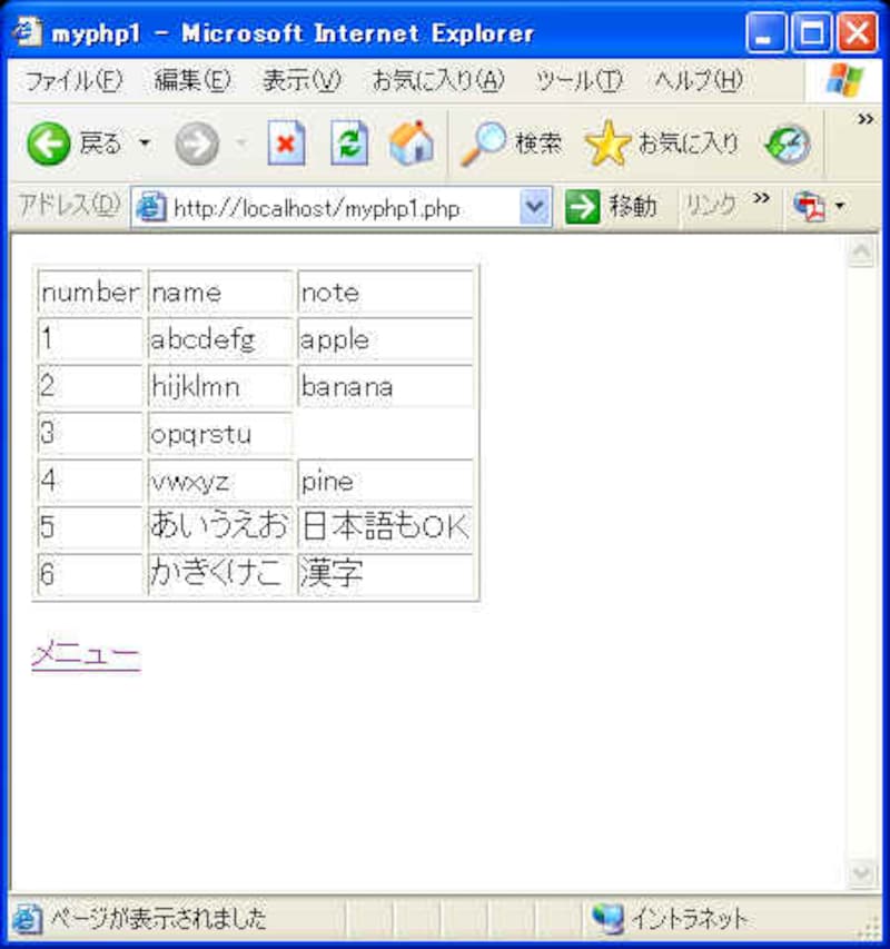 ブラウザを起動し、アドレス欄に http://localhost/myphp.php と入力し、エンターキーを押します。 テストプログラムのメニュー画面が表示されます。 |