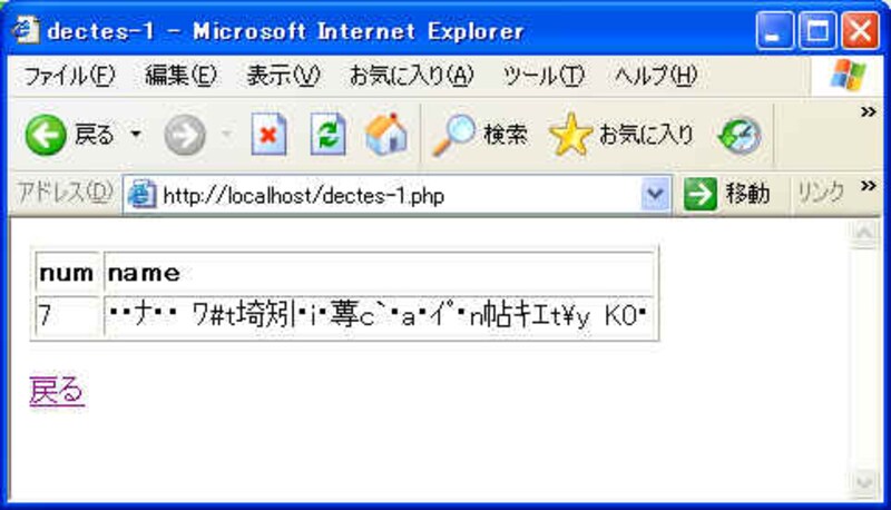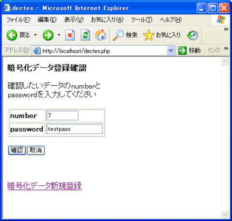 | (画像をクリックすると拡大表示できます) ブラウザを起動し、アドレス欄に http://localhost/dectes.php と入力し、エンターキーを押します。 または「暗号化データ新規登録」(enctes.php)画面のリンク「暗号化データ登録確認」より起動します。 |