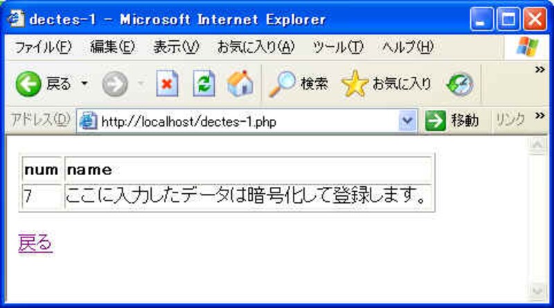 | (画像をクリックすると拡大表示できます) numberとpasswordが一致した場合は暗号化されたnameの内容が復号化されて表示されます。 |