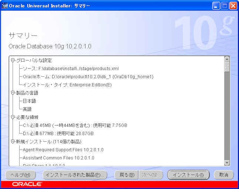 下記の解説中のインストールオプションの選択等はOracle Database 10gをテスト運用するための