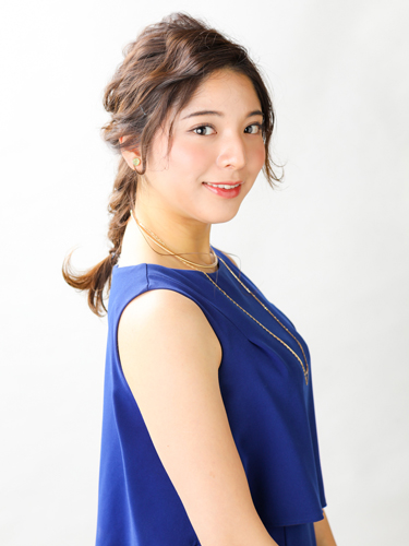 後頭部のあたりで作ったひとつ結びの土台の上に、7:3で分け取った編み込みカチューシャ。その下に三つ編みお団子を作ると、バランス良く仕上がります。編み込みが可愛らしい分、低めの位置のお団子で大人っぽさを演出。