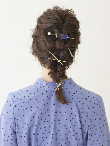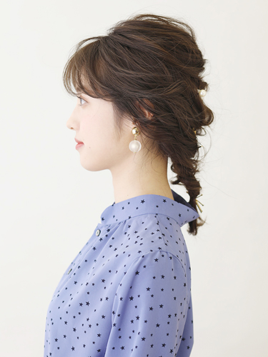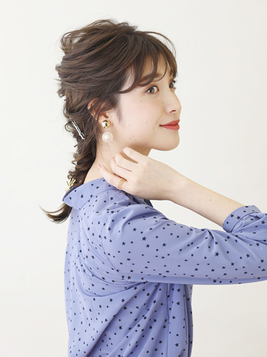 動くたびうなじや背中にやさしく触れる毛束に、ガーリーな気分が盛り上がるフィッシュボーンアレンジ。全体的にふわっとしたシルエットですが、ヘアピンを1本も使わずゴムだけで作っているので、崩れにくさも◎です。耳を隠す毛流れで、ガーリーなだけじゃない大人の女性のニュアンスもチラリ。