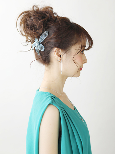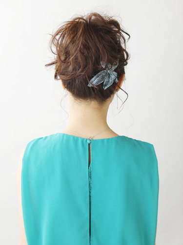 シルバーとブルー、グリーンという繊細な3色のワイヤーで編まれた花びらの中央でスワロフスキーが輝くヘアクリップ。バックスタイルが寂しくなりがちなお団子アレンジは、インパクトのあるヘアアクセサリーを後ろに飾って華やかに。