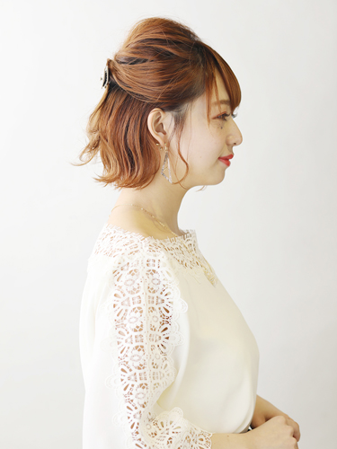 結婚パーティーに今っぽいヘアアレンジで参加したいなら“やり過ぎ感”はNG。オフィスでも違和感がないような上品スタイルがおすすめです。今回はベーシックなくるりんぱ×ハーフアップのアレンジの、毛先を外ハネにすることで、結婚パーティーにも映える華やか&上品なスタイルに仕上げています。