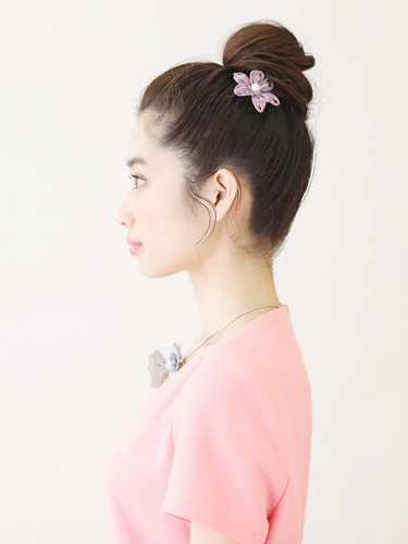 ピンク・シルバー・パープルの3色の繊細なワイヤーでつくられた花びらに、パープルのスワロフスキーが並ぶヘアコーム。ネックレスやブレスレットと、花×パールというモチーフを共通させてオシャレ感UP。
