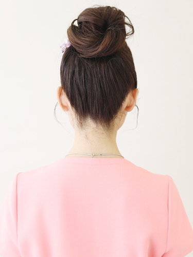 タイトに結んだあと、トップの髪を引き出して丸みを出すのがアレンジのバランスをよく見せるポイントです。お団子の高さを出し過ぎるとカジュアルな雰囲気になるので、ふんわりとした自然な丸みが出るように整えます。
