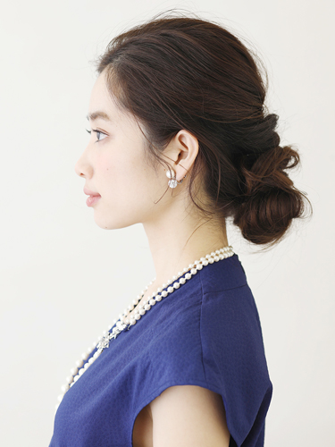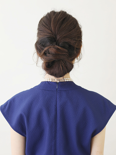 後ろですべての髪をまとめるアレンジは正面から見ると少し寂しくなりがちですが、襟足より下の位置にこぶし大のシニヨンを作ることで、正面寄りの角度からでもアレンジが見えます。横顔にもグッと個性が出てオシャレな雰囲気に。