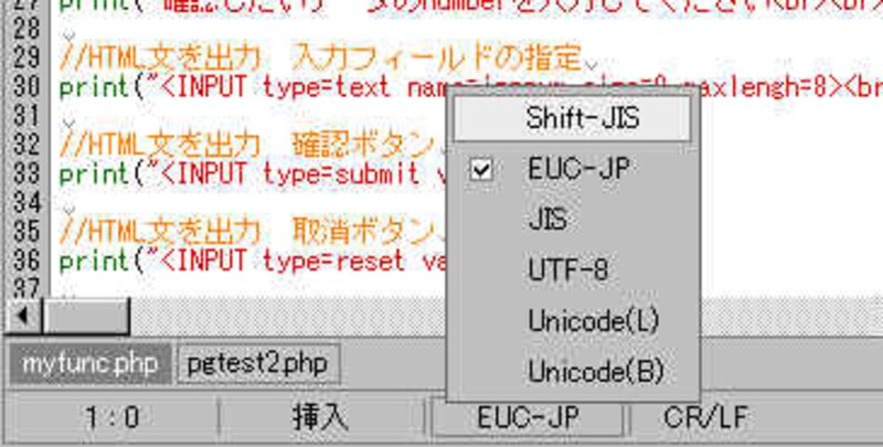 | 図のようにShift-JIS,EUC-JP,JIS,UTF-8N,Unicode(Bigendian),Unicode(LittleEndian)の文字コードの指定が可能です。 |