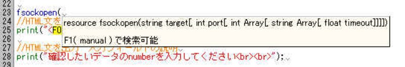 | (画像をクリックすると拡大表示できます) 標準関数はポップアップでヒント表示されます。 更に、F1キーでPHPマニュアルの検索が可能です。 |