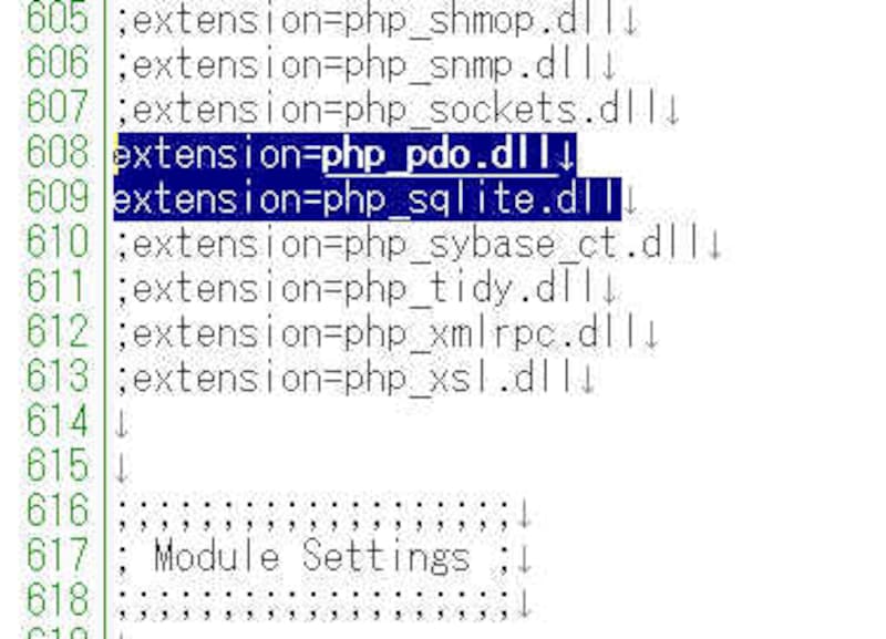 extension=php_pdo.dll extension=php_sqlite.dll の2行を追加します。 |